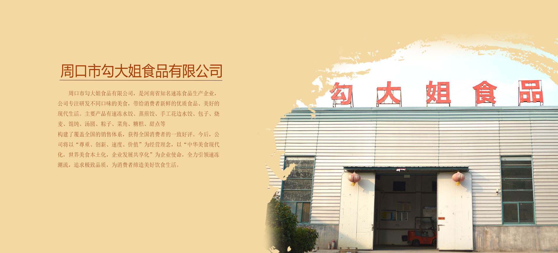 周口市勾大姐食品有限公司,是河南省知名速凍食品生產(chǎn)企業(yè),公司專(zhuān)注研發(fā)不同口味的美食,帶給消費(fèi)者新鮮的優(yōu)質(zhì)食品、美好的現(xiàn)代生活。主要產(chǎn)品有速凍水餃、蒸煎餃、手工花邊水餃、包子、燒麥、餛飩、湯圓、粽子、菜角、糖糕、甜點(diǎn)等。構(gòu)建了覆蓋全國(guó)的銷(xiāo)售體系,獲得全國(guó)消費(fèi)者的一致好評(píng)。今后,公司將以“尊重、創(chuàng)新、速度、價(jià)值”為經(jīng)營(yíng)理念,以“中華美食現(xiàn)代化,世界美食本土化,企業(yè)發(fā)展共享化”為企業(yè)使命,全力引領(lǐng)速凍潮流,追求極致品質(zhì),為消費(fèi)者締造美好飲食生活。